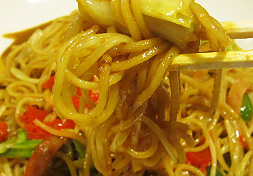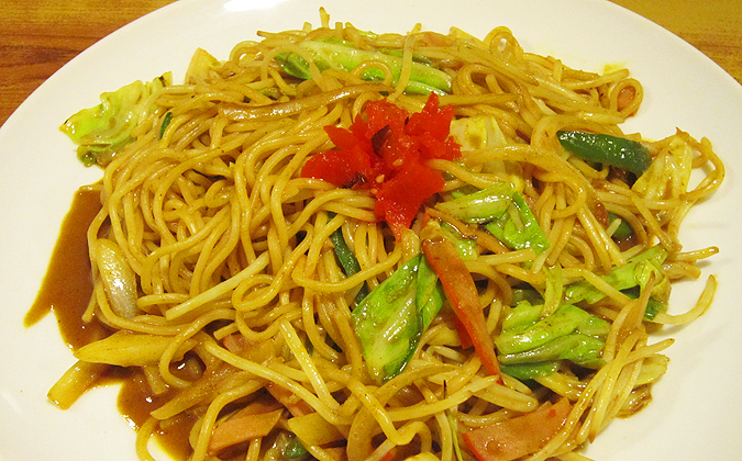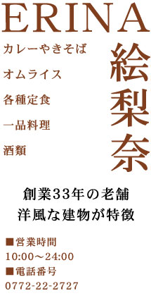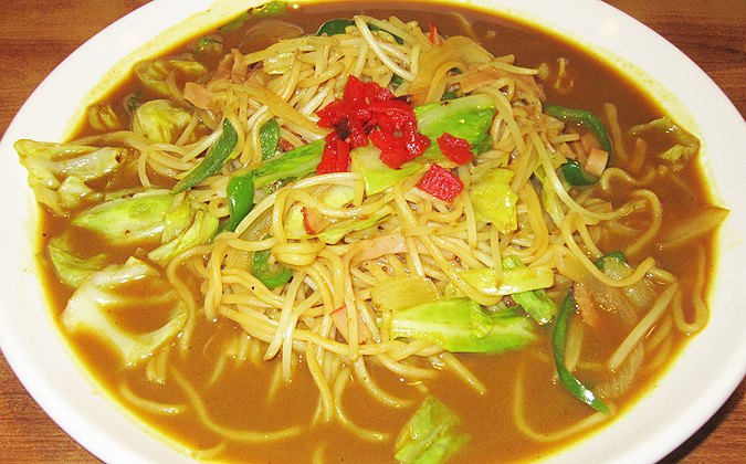 宮津市内に1979年開店の老舗、カフェレスト絵梨奈。その中で20年以上前から出しているソウルフード、カレー焼きそば。豚で取ったスープに、数種類のスパイスを利かせて仕上げており「宮津1スパイシー」と言われるほどです。具は、キャベツ、タマネギ、ピーマンなど地元の野菜とハムです。