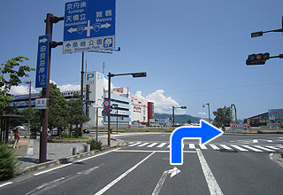 ①宮津天橋立ICを降りてまっすぐ進むと大きな交差点があります。ここを右折(東側)します。
